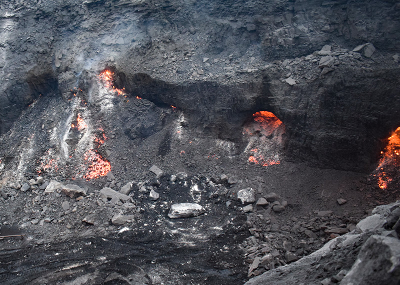 These fires weaken the overlying strata, causing ground collapse, while also releasing *toxic gases* such as carbon monoxide and sulfur compounds, which pose serious health risks to humans and animals in the surrounding areas.